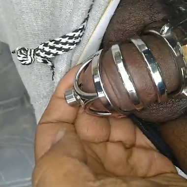 "After 4 days Outdoor Chastity Cage show off Huge bulge"