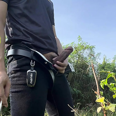 "Big cock with sex toy outdoor."