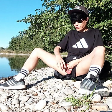 "Where will he cum? After working out outside near a lake, this gay Asian twink takes his cock out of his very short shorts and j"